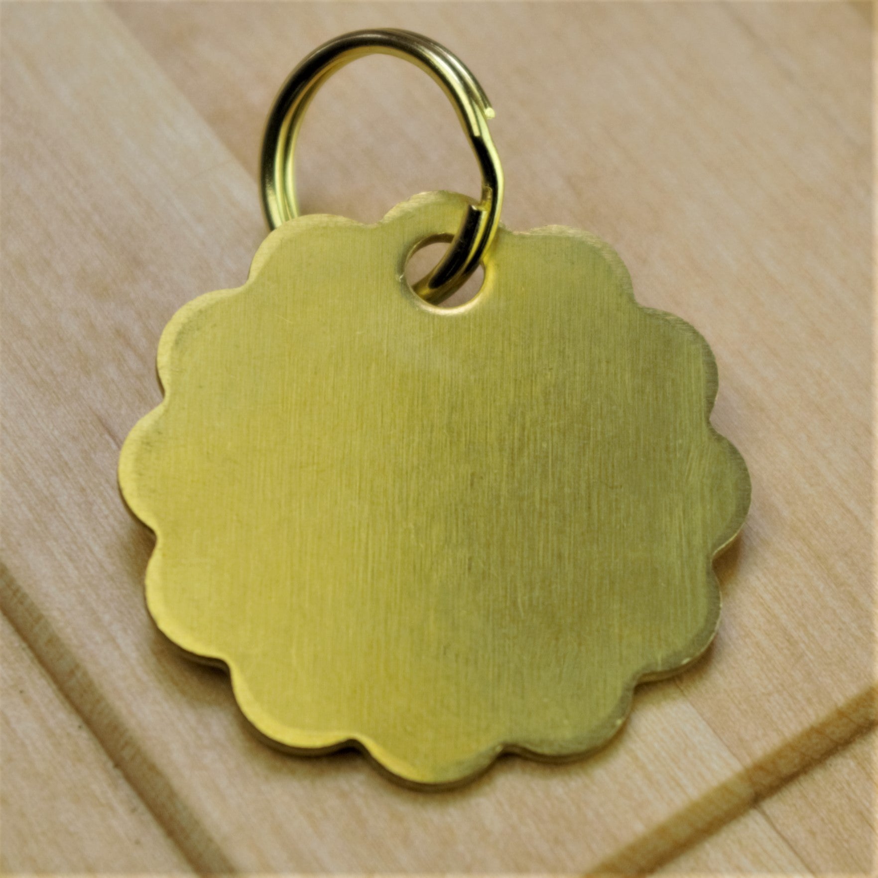 A small round brass pet / home identification tag with “cloud” edges and a satin finish that can be engraved on both sides.