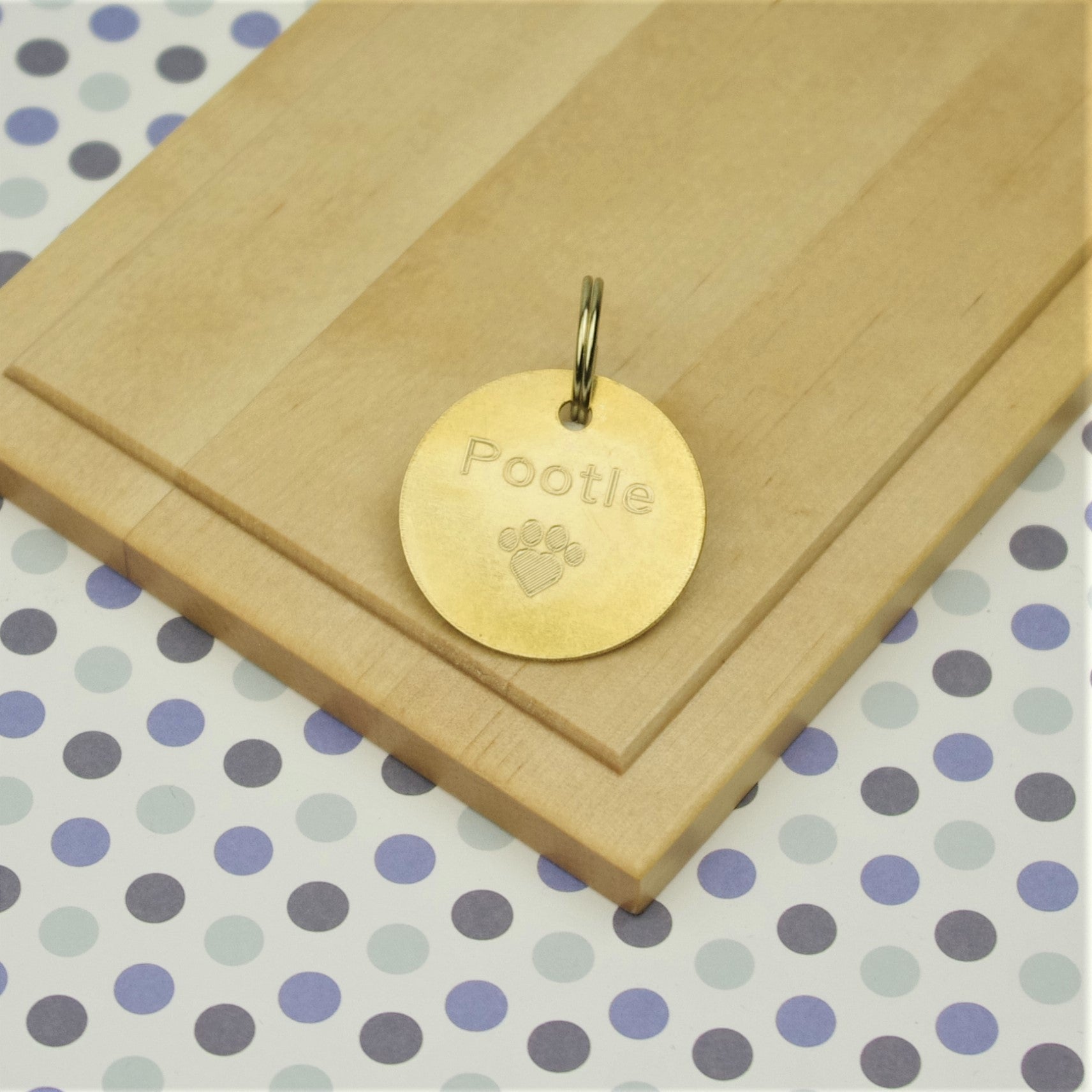 A solid brass pet identity tag with a paw motif design and a name engraved on the front & details on the back.