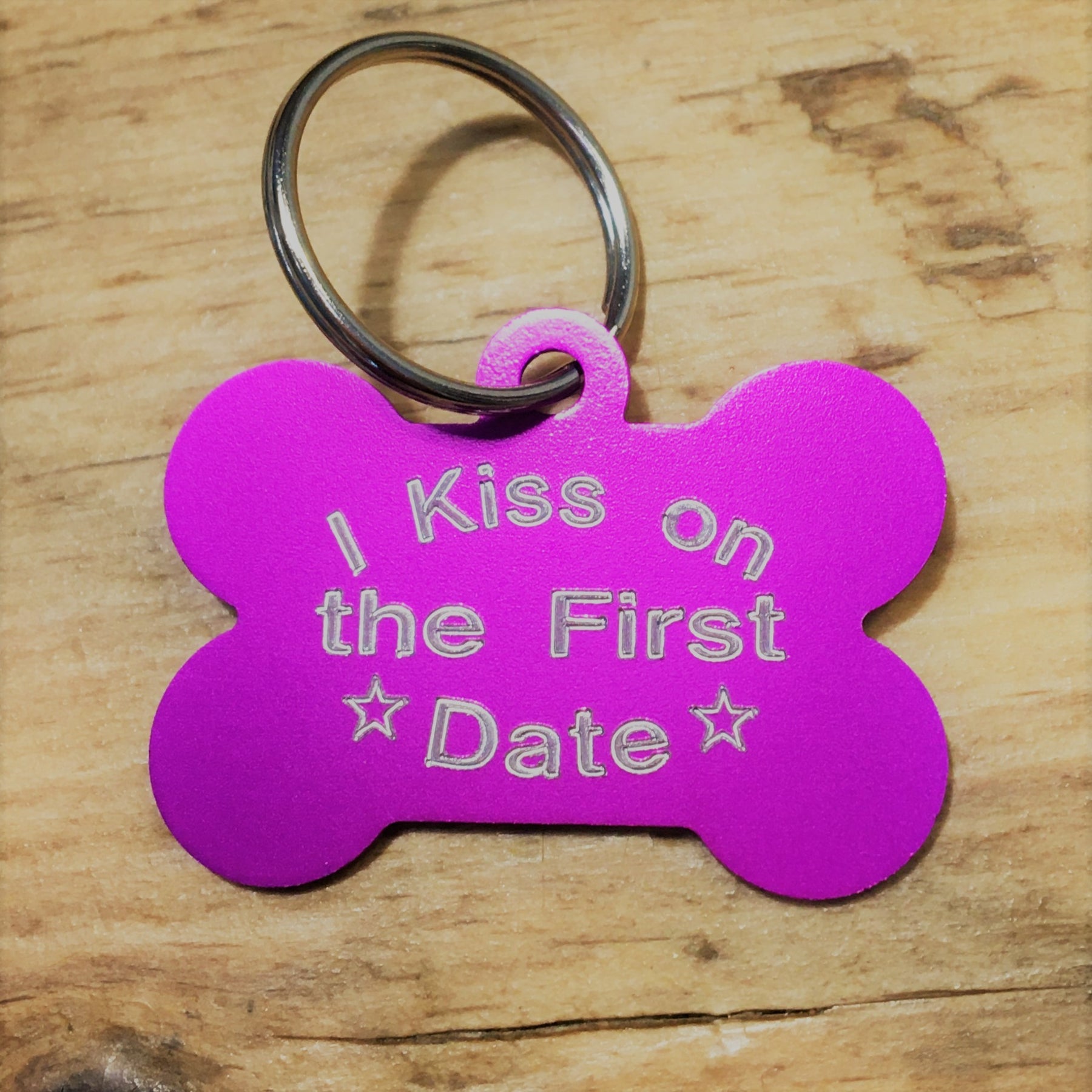 'I Kiss on the First Date' Bone Shaped Funny Dog ID Tag – Choice Of Size & Colour
